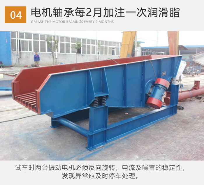 ⒋試車時兩臺振動電機必須反向旋轉,電流及噪音的穩定性,發現異常應及時停車處理。